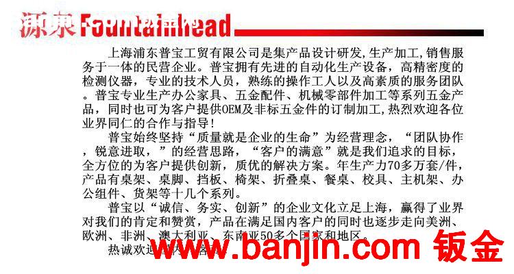 上海浦东普宝工贸有限公司是集产品设计研发,生产加工,销售服务于一体的民营企业。普宝拥有先进的自动化生产设备,高精密度的检测仪器,专业的技术人员,熟练的操作工人以及高素质的服务团队。普宝专业生产办公家具、五金配件、机械零部件加工等系列五金产品,同时也可为客户提供OEM及非标五金件的订制加工,热烈欢迎各位业界同仁的合作与指导!